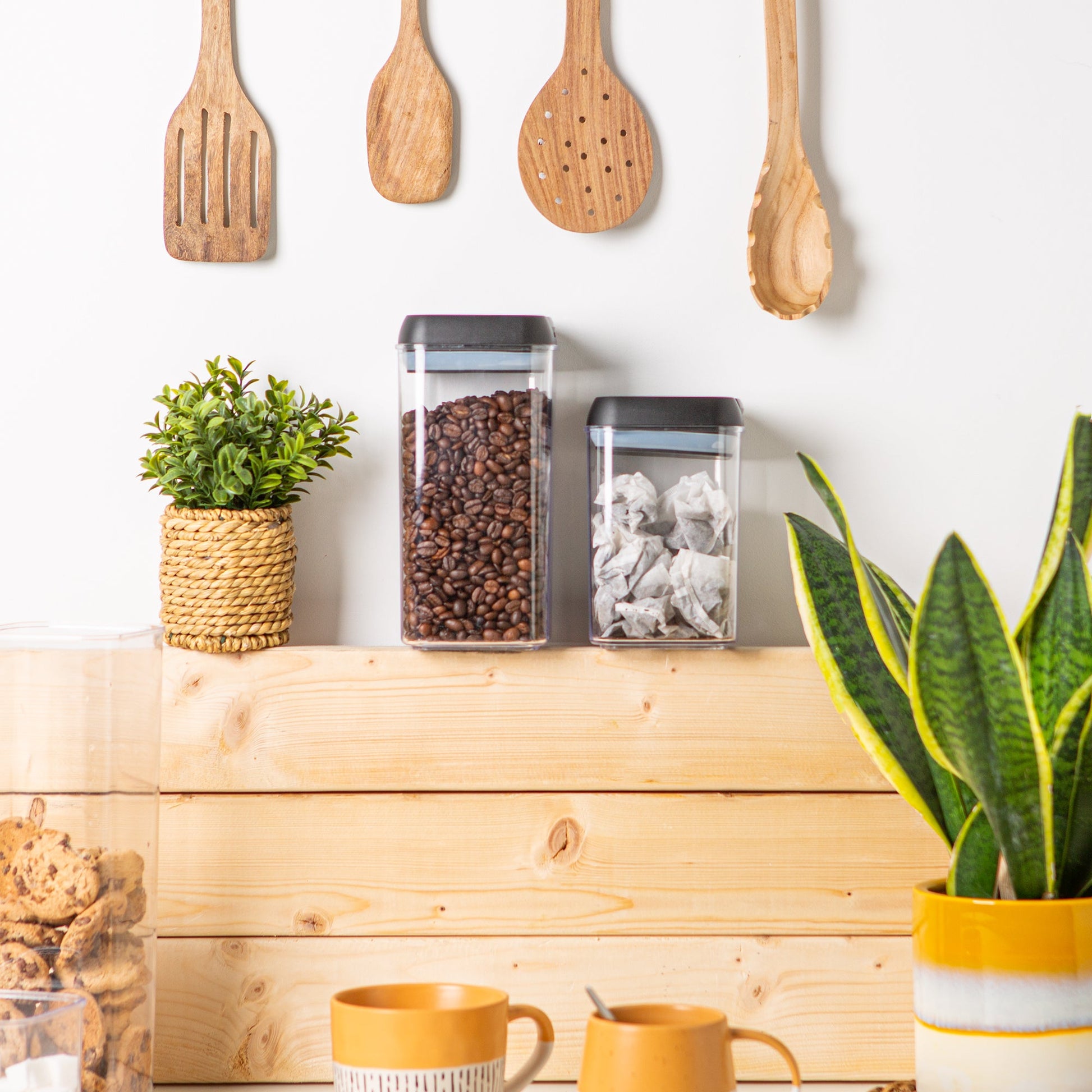 Designed for maximum space efficiency; these stackable canisters can be easily customised to fit any space. Each container is sized perfectly to store everyday household staples including cereal, flour, sugar, pasta, rice, coffee, nuts, snacks, and sweets!